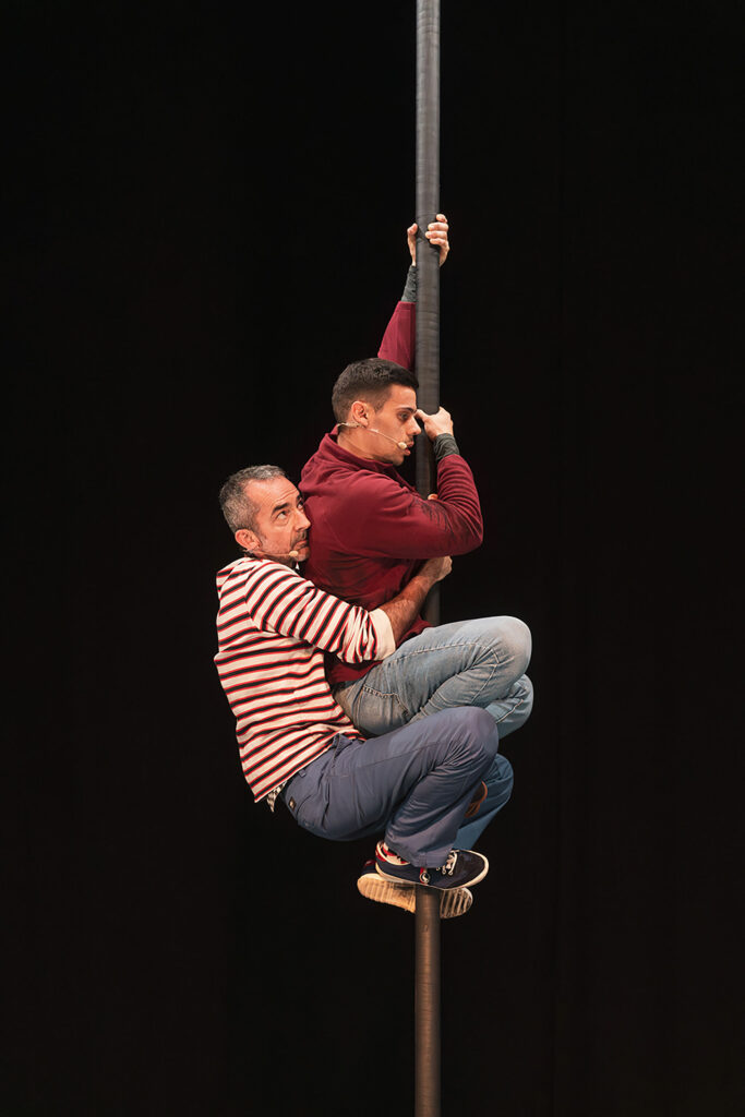 In a scene centered around a Chinese pole topped with coconut palms, the two dream of Friday and Crusoe, without really knowing who these literary characters would be today. They pour their hearts out, surprising audiences with their aerial tricks and making them laugh with their comical situations, with one (the circus performer) serving as an armchair, or even a bed, for the other (the actor), who can continue his oration while being comfortably suspended.