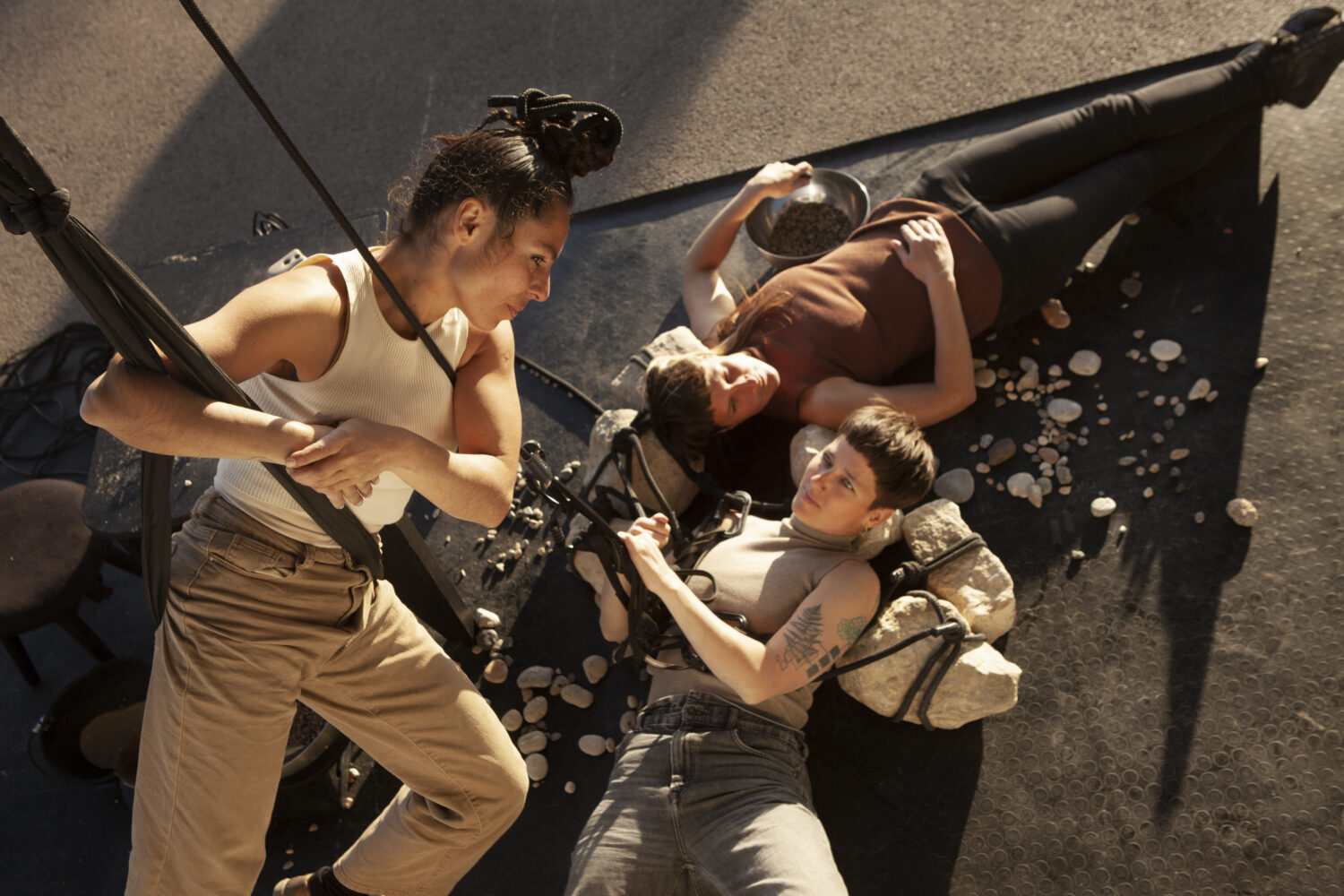 The artists experiment with the relationship between the body and gravity. They explore the delicate space where pleasure and pain find balance to achieve flight.
