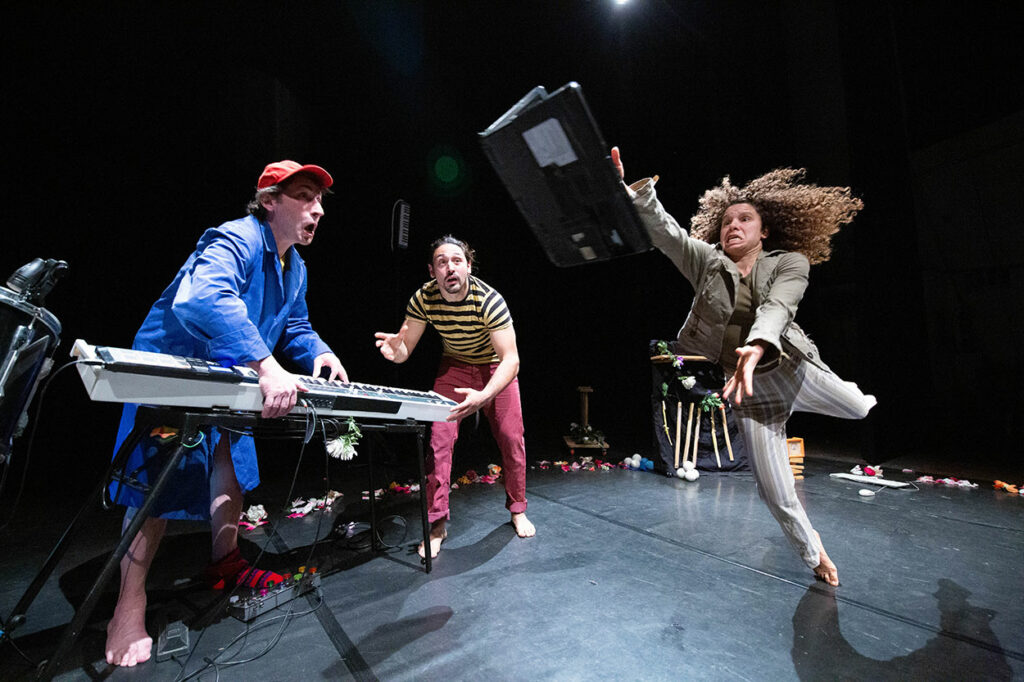 Colombo, Susana, and Pollo are in perfect harmony. With contagious energy and humor, the artists reinterpret the carnival arts by switching between their different disciplines. The musician is sometimes a circus performer, while the acrobat tries to make the note Fa with the tip of their toe.