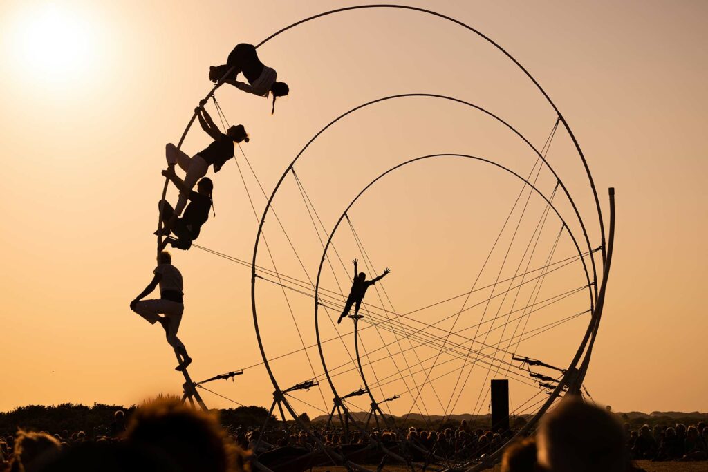Upon a monumental structure featuring a six-meter-high spiral made up of three huge loops of steel wire, five acrobats soar through the air.