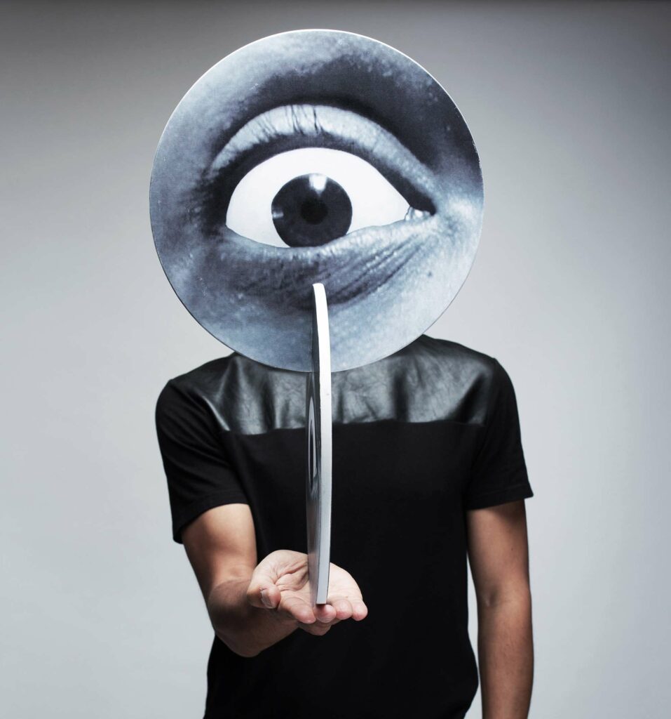 In his quest, the performer is followed by circular objects representing eyes. These become living creatures that he manipulates to electronic rhythms. They move, distort, and confuse us with their optical illusions. The result is an atmosphere that evokes the world of science fiction.