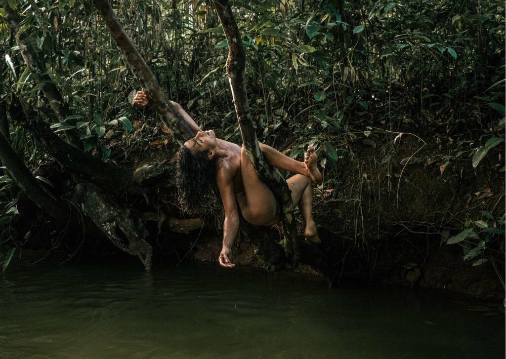 Assuming the role of an ape, the performer mixes personal stories and decolonial thinking on stage. She begins by taking us to a tree transformed into an acrobatic apparatus. This is followed by a performance-conference on the notions of nature and culture, in which she quotes the Quilombola philosopher Nego Bispo, a cornerstone of her creative research. The show concludes with an intoxicating DJ set, inviting us to dance and celebrate our ancestral roots.