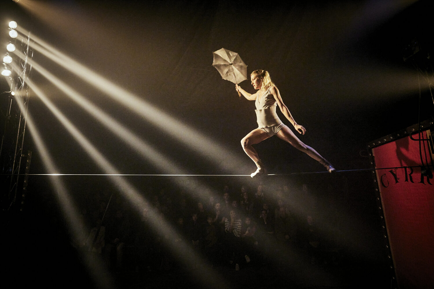 They offer a delicate reinterpretation of circus conventions: balancing on a tightrope, having fun throwing knives, and dancing in mid-air to the rhythm of the barrel organ. The performance questions something mystical, something spiritual: what the circus and death have in common.
