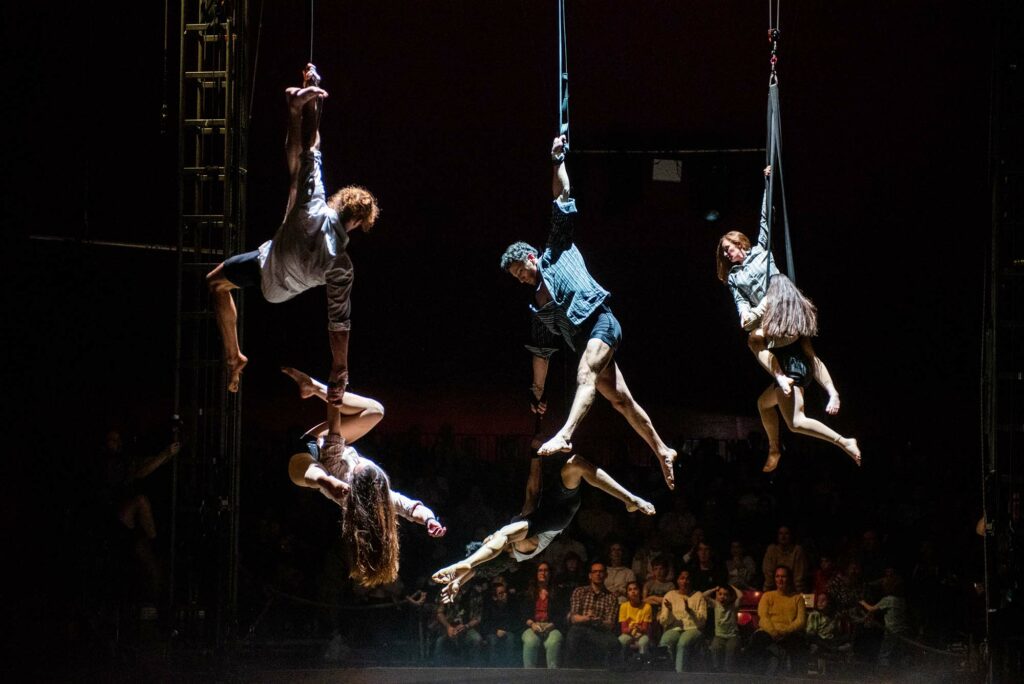 In a series of spectacular scenes, they interweave diverse circus feats: acrobatics, hand-to-hand balancing, hoop, Chinese pole, slackline… These high-flying routines evoke a world under severe duress, one that is beset by multiple struggles such as population displacement and the climate crisis. These essential issues are addressed with audacity.
