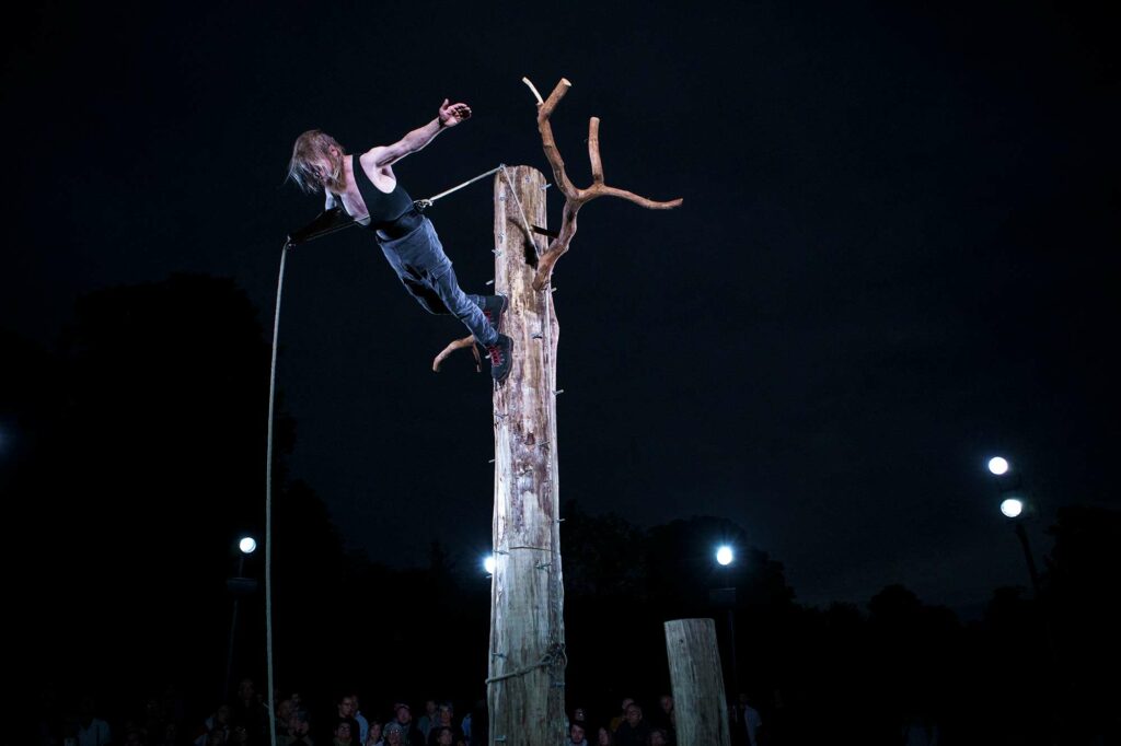 In this creation, three short plays that are performed in three different venues (indoors, big top, and outdoors) combine to form a single show. Trilokia is a poetic exploration of humanity’s relationship with the living world and the three parts – Ꮖeau, Ferfeu, and Harbre are all performed by the artistic alchemist Jani Nuutinen. The creations are composed of fantastical images, and audiences are transported inside them as if they were in a dream. A cross between dance, acrobatics, and object manipulation, the performer becomes a magician trying to master the elements. He transforms a space into a sheet of rippling water, defies fire, seeks to enter into communion with a tree.