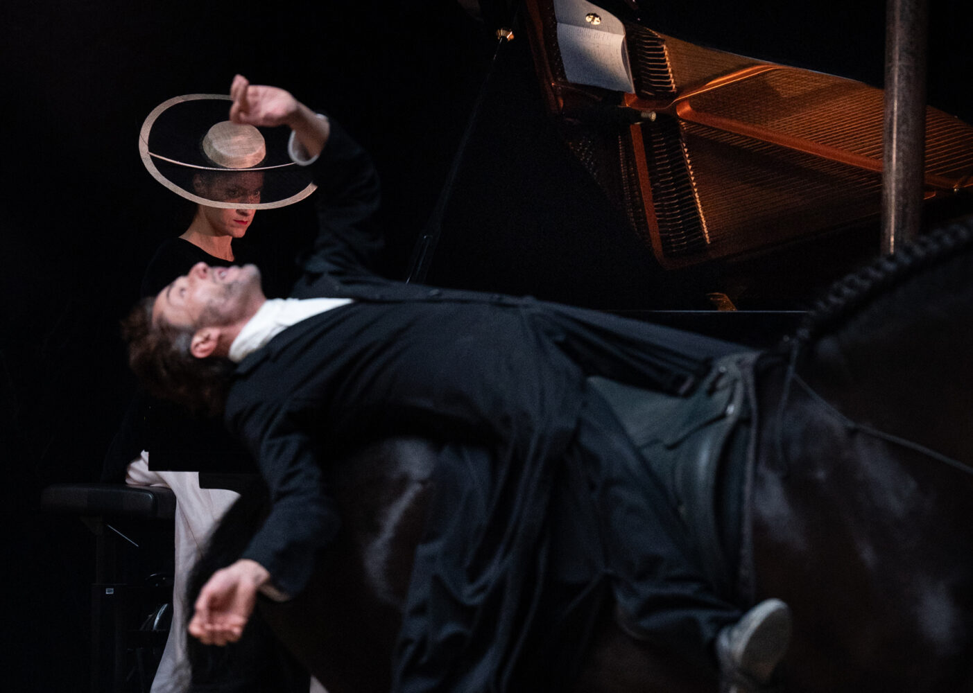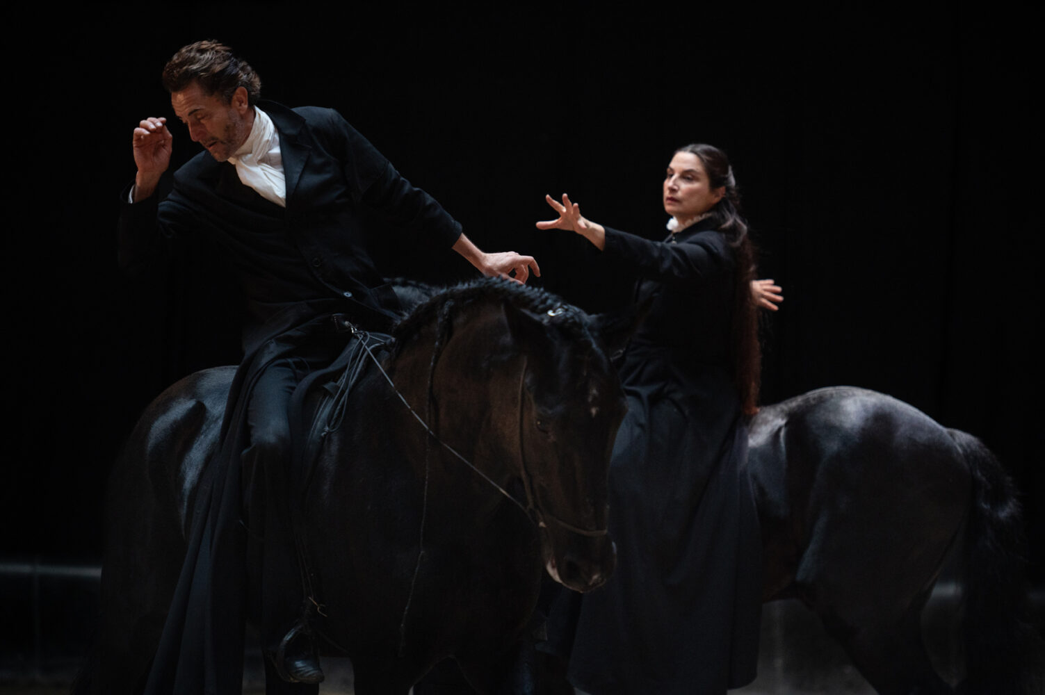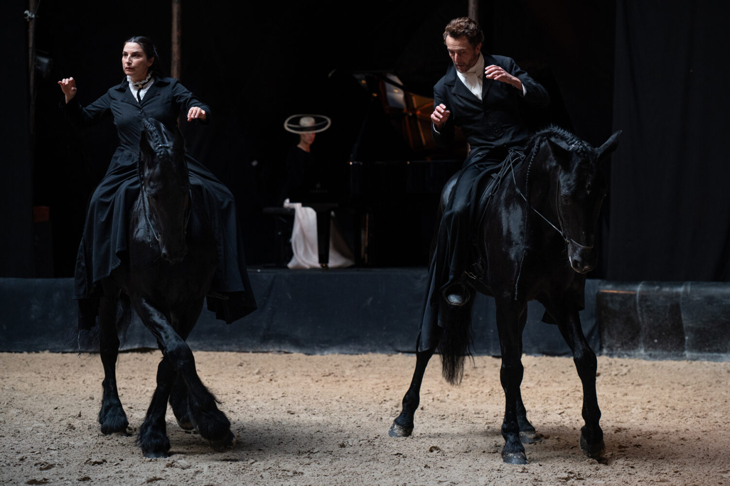 Présenté en avant-première à la BIAC 2025, ce spectacle poétique est une quête de liens. Camille et Manolo sont des artistes hors norme. Ils développent, depuis trente ans, une relation intime entre humains et chevaux. Pour eux, le centaure est une créature poétique, un choix de vie et une utopie. Entre chiens et loups est un voyage au coeur de leur démarche, entre sauvage et domestique. Immergés dans la musique envoûtante d’Agathe Di Piro où le chant surgit parfois, les deux artistes et les quatre étalons s’élancent aux côtés du piano à queue. Dans un jaillissement d’énergie ou dans une étreinte au ralenti, ils exécutent de très belles figures composées de voltiges et de boucles répétitives. Ils nous offrent ainsi une danse organique écrite à six corps. Jusqu’à ne faire qu’un.