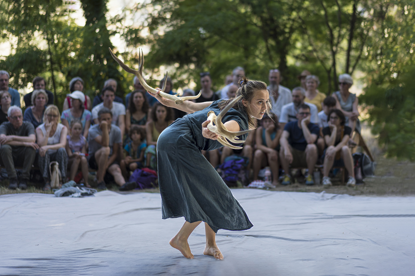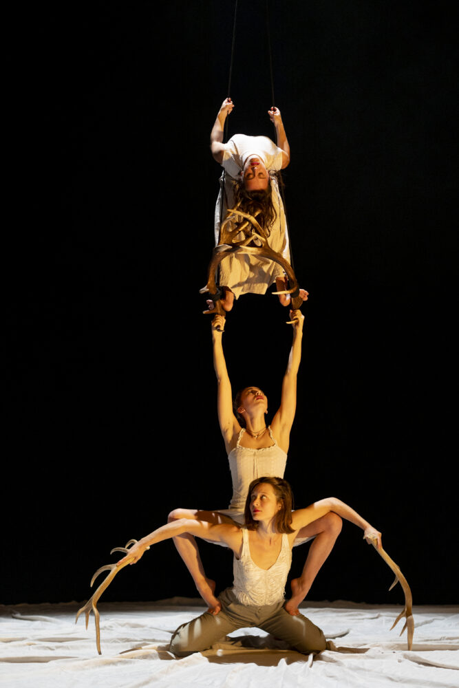De tout temps, le cerf a passionné les hommes par sa majesté et sa puissance. Gracieux et indomptable, il nourrit les mythes d’hier et d’aujourd’hui. Il fascine par sa mue, et la chute de ses bois qui, chaque année, incarne merveilleusement le cycle de la vie. En musique, trois circassiennes se laissent traverser par cette figure sauvage du cerf. Sur scène, elles s’emparent de ses bois qu’elles transforment en agrès de cirque. Au sol comme dans les airs, elles les manipulent, les accrochent, les suspendent dans un terrain de jeu acrobatique et chorégraphique riche et audacieux. À travers leurs gestes, doux mélange de force et de délicatesse, les artistes évoquent la chasse, le brame, la danse de séduction ou d’intimidation, la harde en mouvement. Tout un imaginaire animalier empreint de sagesse.